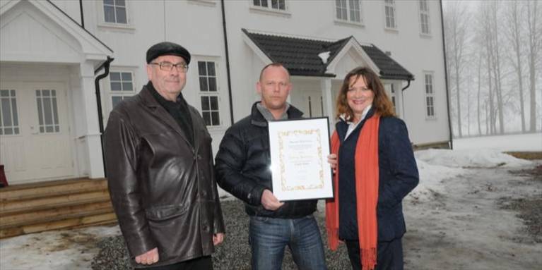 Mottar pris: I kveld mottar Tommy Martinsen pris for istandsetting av gamle Greni skole. Jan Erik Horgen og Karin Valen-Sendstad i Raumnes historielag gratulerer. Foto: Lisbet Bekkeli Amundsen