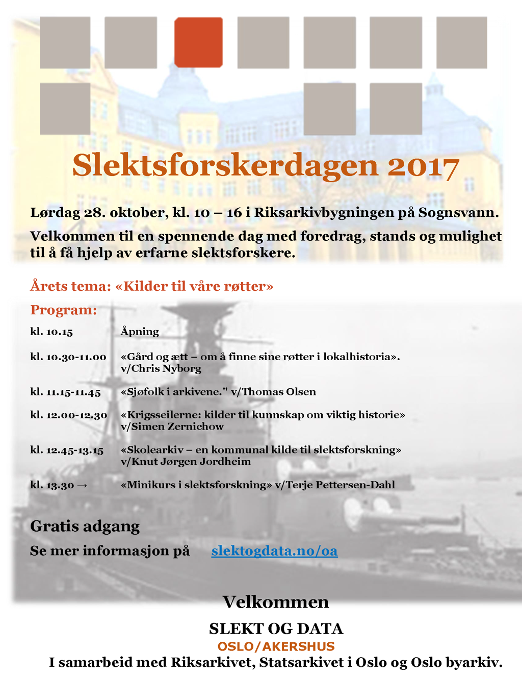 Foreningen Slekt og Data arrangerer den årlige slektsforskerdagen lørdag 28. oktober over hele landet. Arrangementet i Oslo og Akershus skjer på Riksarkivet mellom kl 10.00 og 16:00.